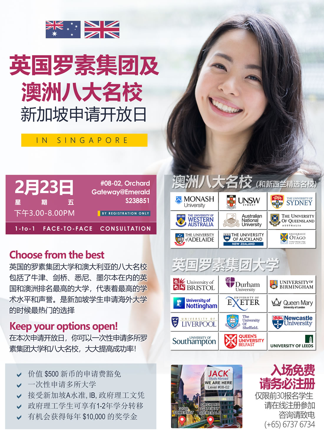 新加坡杰克留学将在索美塞的OrchardGateway大楼8楼开办”英国罗素集团和澳洲八大名校申请开放日”活动。这是一次性申请英国、澳洲、新西兰顶级名校最好机会。